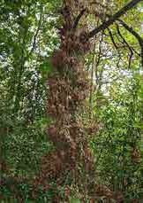 Exemplar de poderoso porte, que medra a carón dun camiño que accede ao río, no espazo de transición entre as plantacións forestais de piñeiros e eucaliptos coa vexetación natural da ribeira do Miño. O fuste é recto con numerosas marcas de podas laterais na metade inferior, o cal contribúe, xunto á competencia coas árbores circundantes, a configurar copa a partir de media altura.