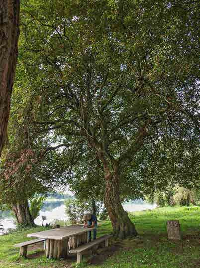 Magnífico pé de salgueiro que se conserva nunha zona recreativa na beira do Miño, cun porte arbóreo e unha altura nada habituais na especie. Ten un único fuste, que comeza inclinado pero recupera verticalidade, para abrir en tres grandes ramas a 3 m de altura, que conforman unha copa moi fermosa e equilibrada. Na súa proximidade crecen outros salgueiros de bo porte e tamén varios salgueiros irtos (Salix fragilis), ademais dalgún chopo híbrido (Populus x canadensis).