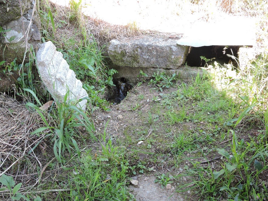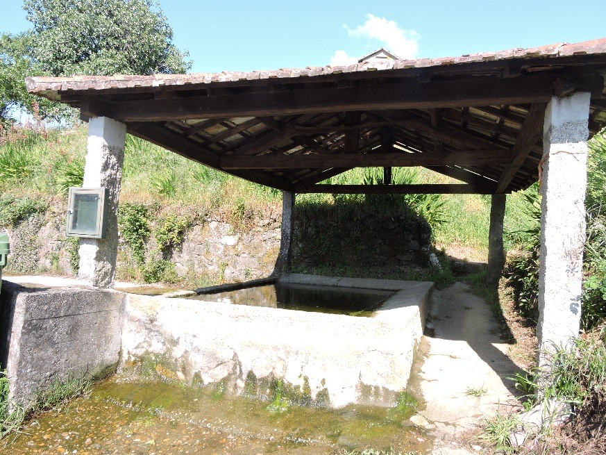 Recibe auga dunha fonte que se encontra na parte traseira, e desauga nunha poza situada no lado esquerdo.