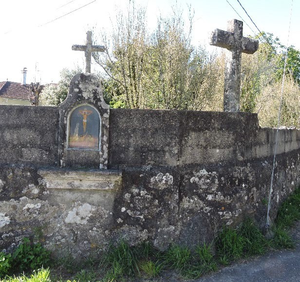 Peto de ánimas e cruz alta situados no muro dunha finca do Barrio da pedra.
